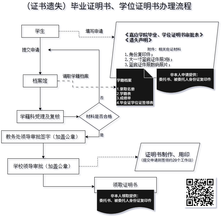 申请者本人填写《嘉应学院毕业/学位证明书审批表》、《遗失声明》→档案馆打印《学籍档案一套》→携带审批表、学籍档案、3张大一寸近期蓝底免冠(含同底电子版)证件照到学籍科→手续齐全材料合格后受理,证明书审核制作及用印耗时约20个工作日可取(暂未提供邮寄服务)。