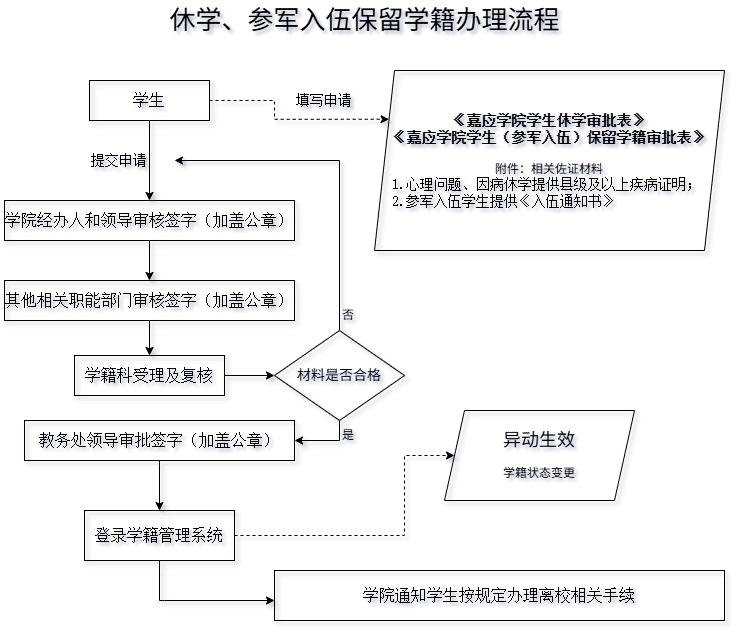 保留学籍(参军入伍) | 填写《嘉应学院学生保留学籍审批表(参军入伍)》,附佐证材料《入伍通知书》复印件→学院经办人和领导审核签字(加盖公章)→其他相关职能部门审核签字(加盖公章)→学籍科复核→教务处领导签字→学籍科受理并变更学籍状态。 |