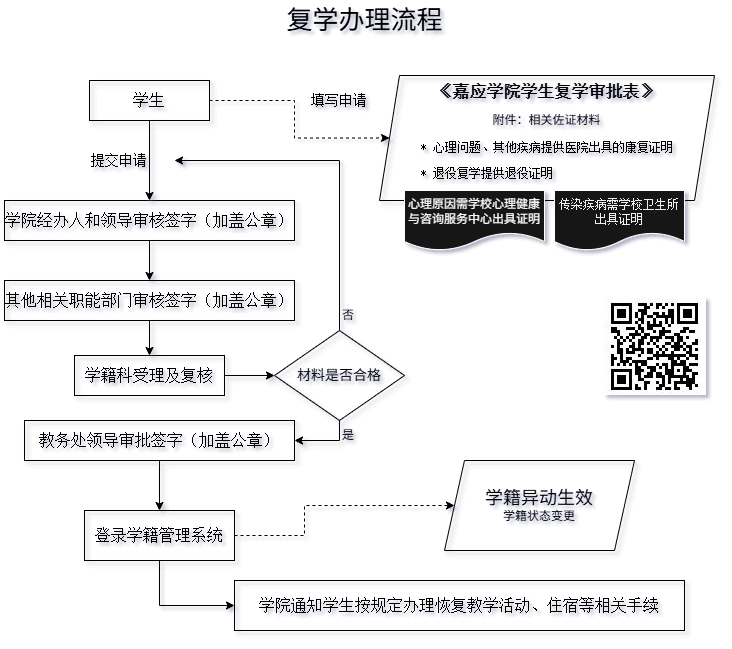 学生本人填写《嘉应学院学生复学审批表》并提交有关证明材料(心理问题、其他疾病提供医院出具的康复证明;心理问题需要校心理健康与咨询中心出具证明、传染疾病需校卫生所出具证明)→学院经办人和领导审核签字(加盖公章)→其他相关职能部门审核签字(加盖公章)→学籍科复核→教务处领导签字→学籍科受理并变更学籍状态→学院通知学生按规定办理学籍异动手续。 注:退役军人复学,附佐证材料《退役证明》复印件